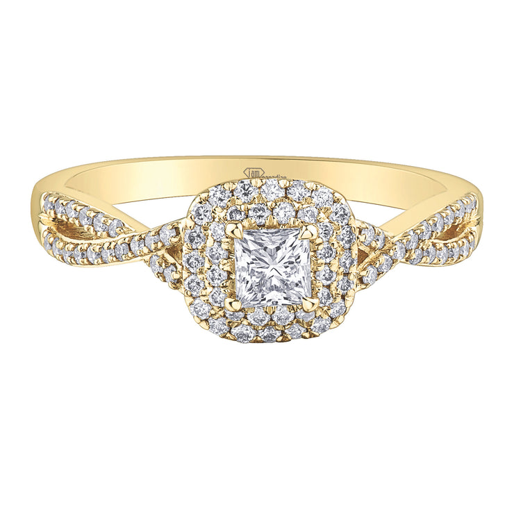 10K Yellow Gold Ring With Princess Cut Center Diamond In Double Halo And Diamond Pavé Twist Band Design 0.50ct Total Weight In Diamonds